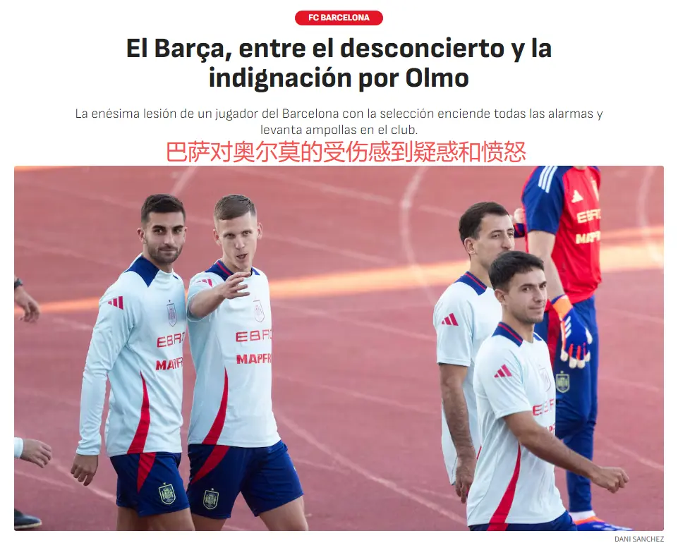 奥尔莫再次受伤,巴萨俱乐部将矛头指向西班牙足协和主帅德拉富恩特。《阿斯报》指出,奥尔莫前往国家队时,还带着巴萨出具的医疗报告,指出奥尔莫有肌肉疲劳等不适症状,建议国家队谨慎使用球员。奥尔莫的身体状态欠佳,但主帅德拉富恩特还是征召并使用巴萨前腰。